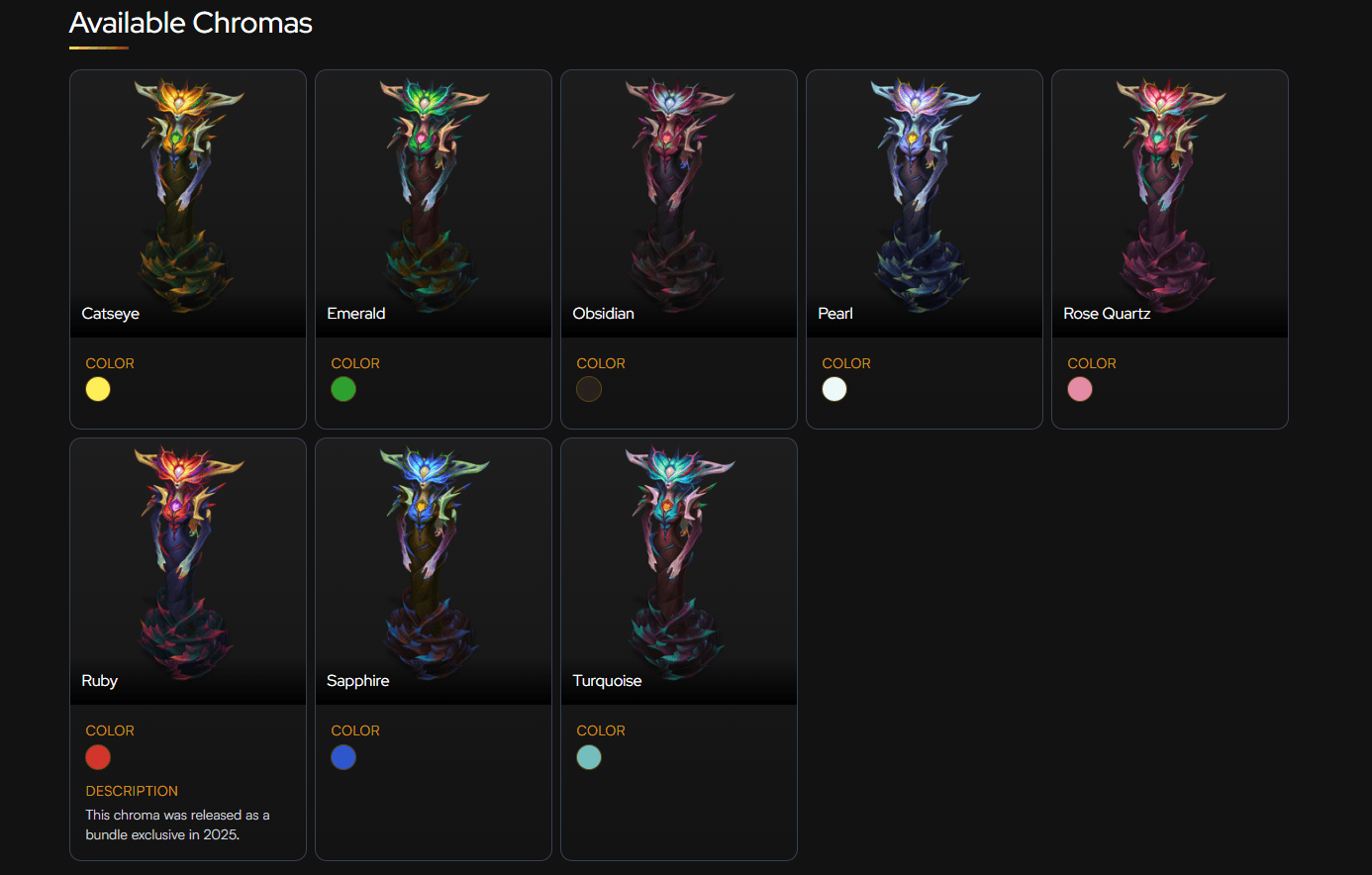 Chromas are color variants, and databases often list them one by one under the same skin. Names like Catseye and Emerald are common naming patterns, which helps you identify whether a page is showing a new skin or just an alternate palette.