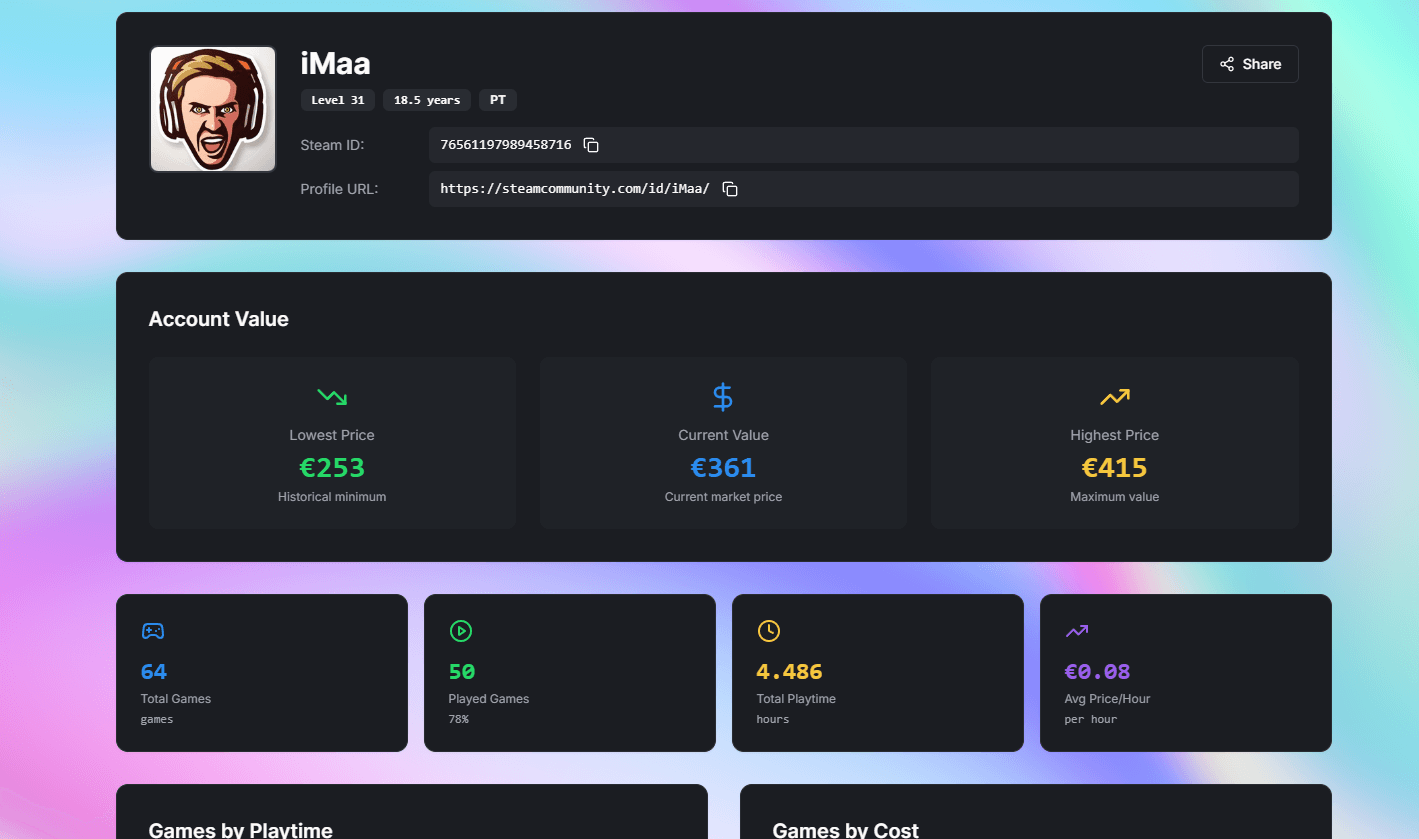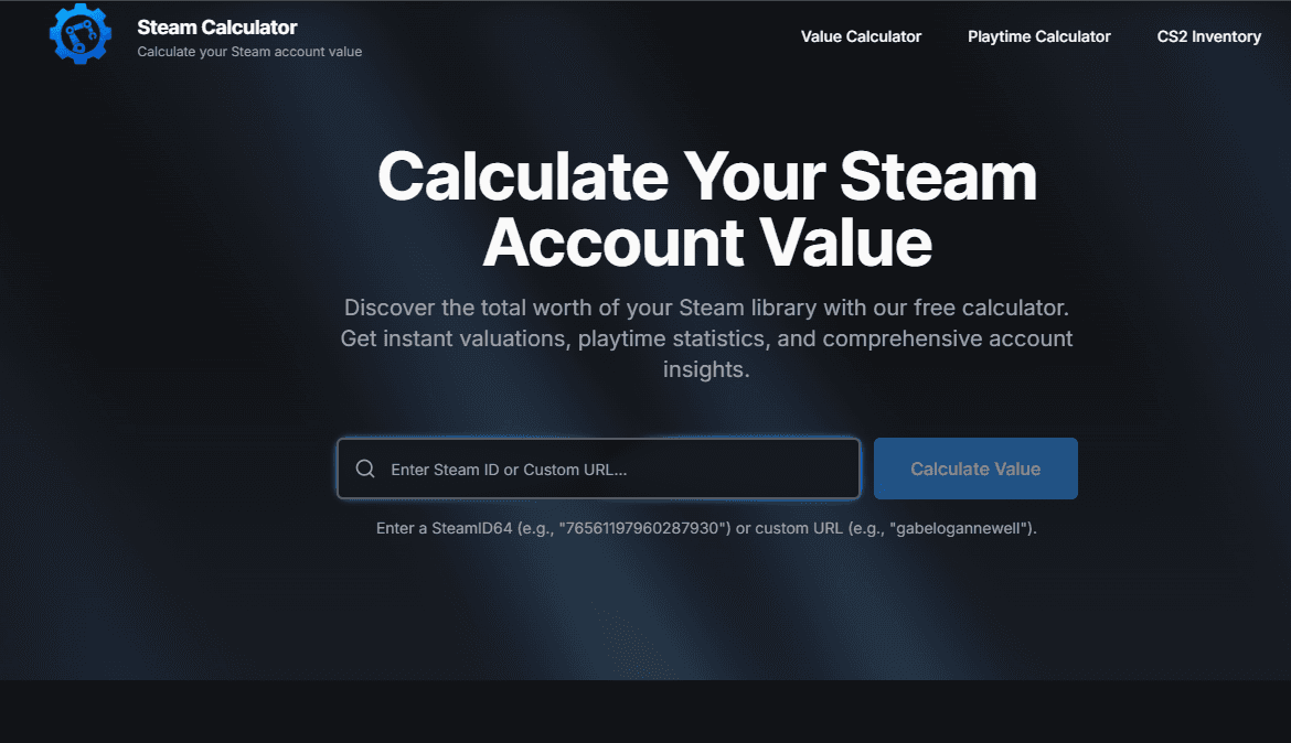 SteamCalculator.gg is still the quickest for rapid account analysis. The site brings up detailed stats on games, when you played them, and how much they contribute to the total value, just seconds after you insert your Steam name or ID, which shows an in-depth breakdown that can frequently generate a surprise account valuation.
