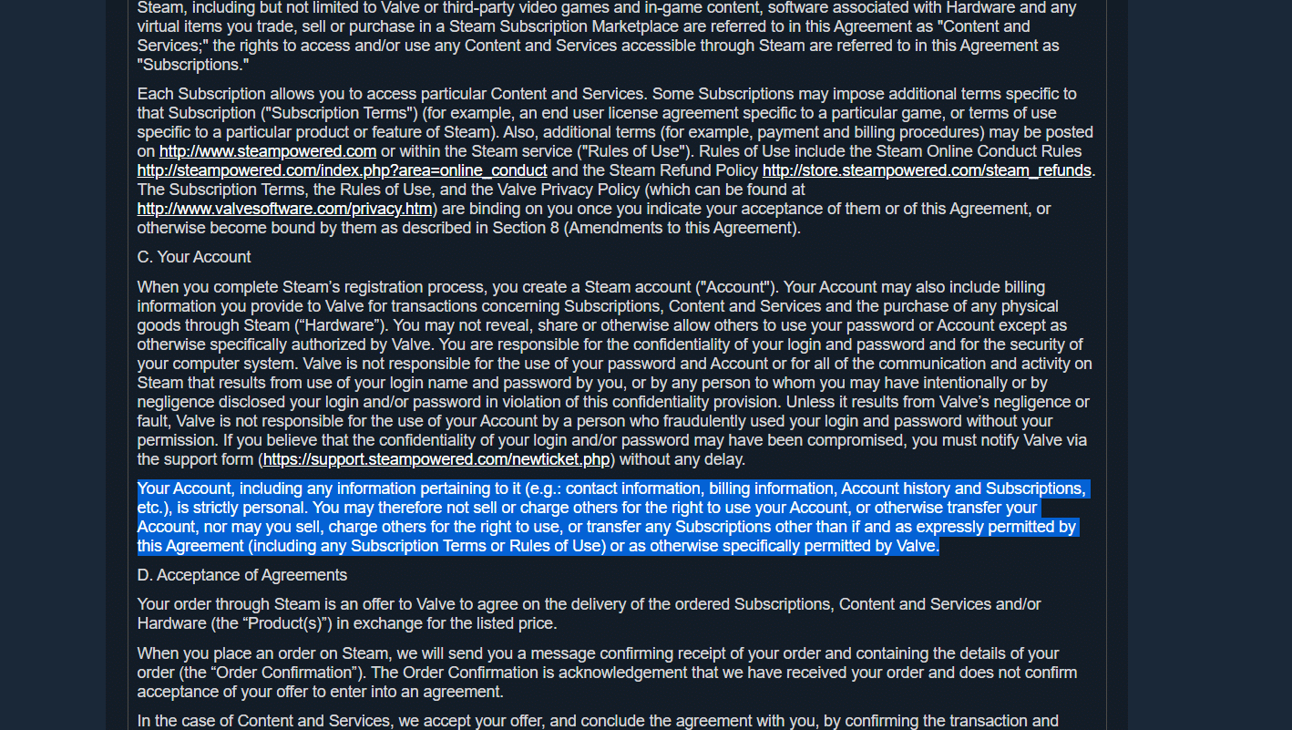 The Steam Subscriber Agreement disallows the sale of accounts, leaving transactions for single items as the only legal way to profit from digital goods. Third-party markets also provide secure environments which trading skins without breaking any terms of service.