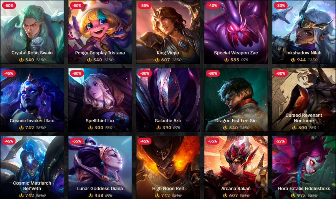 15 skins and 5 champions. These offers run for one week before rotating out.